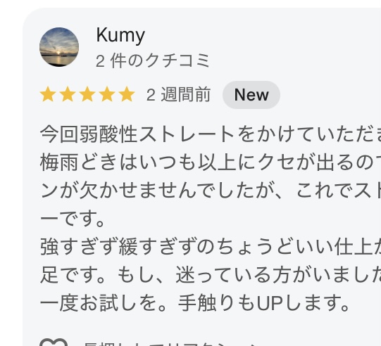 ストレートかけて本当によかったです。今もサラサラで手触り良い物です。いつも丁寧なカウンセリングに施術ありがとうございます。